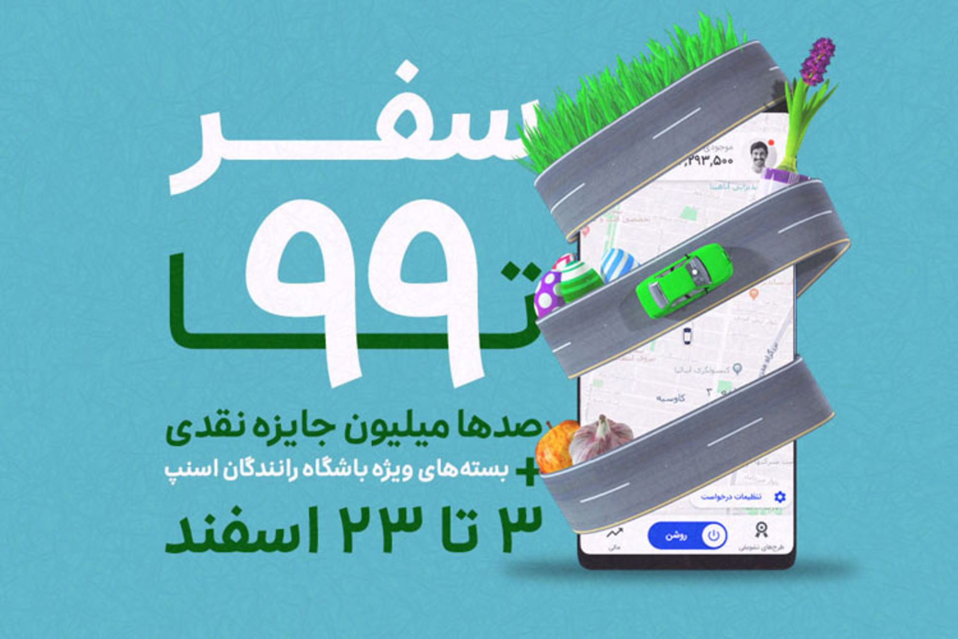 اسنپ برای متعادلکردن عرضه و تقاضای سفر در شبهای منتهی به سال نو، کمپینی بهنام «سفر تا ۹۹» تدارک دیده است که از سوم تا بیستوسوم اسفند بهمدت سه هفته برگزار میشود. در این کمپین، به بیش از هفتهزار راننده بیش از یکمیلیارد تومان جایزه پرداخت خواهد شد. کاربران راننده باید برای شرکت در قرعهکشی در بازههای سهروزه تعداد مشخصی از سفر را انجام دهند. هر هفته دوبار قرعهکشی (شنبه و سهشنبه) انجام و جوایز به رانندگان واجدشرایط پرداخت خواهد شد. تمام امتیازات کسبشده در بازههای سهروزه نیز برای رانندگان محاسبه و درپایان کمپین ۲۱ روزه، رانندگان با مجموع امتیازهای خود در قرعهکشی جایزه بزرگ شرکت داده میشوند.