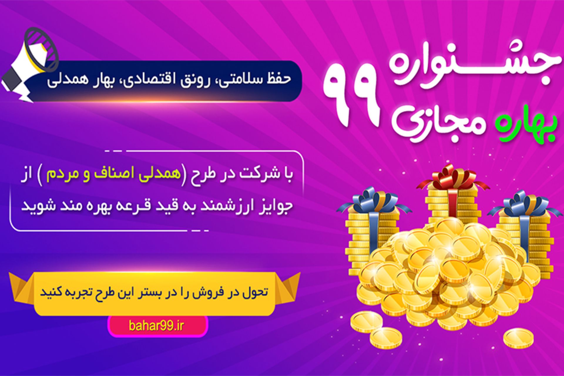 جشنوارهی بهارهی مجازی برای ارائهی کالاها به مردم در شب عید ایجاد شده است؛ بهطوریکه مردم میتوانند بدون مراجعهی فیزیکی، در منزل اقلام موردنیاز خود را با تخفیف بخرند. بهگفتهی وی، محصولات خریدشده در این جشنواره با رعایت کامل نکات بهداشتی و بستهبندی و به مشتریان عرضه خواهد شد. براساس این طرح، آن دسته از واحدهای صنفی که با کاهش فروش مواجه شدهاند، حمایت میشوند و میتوانند محصولات خود را در فضای مجازی بفروشند.