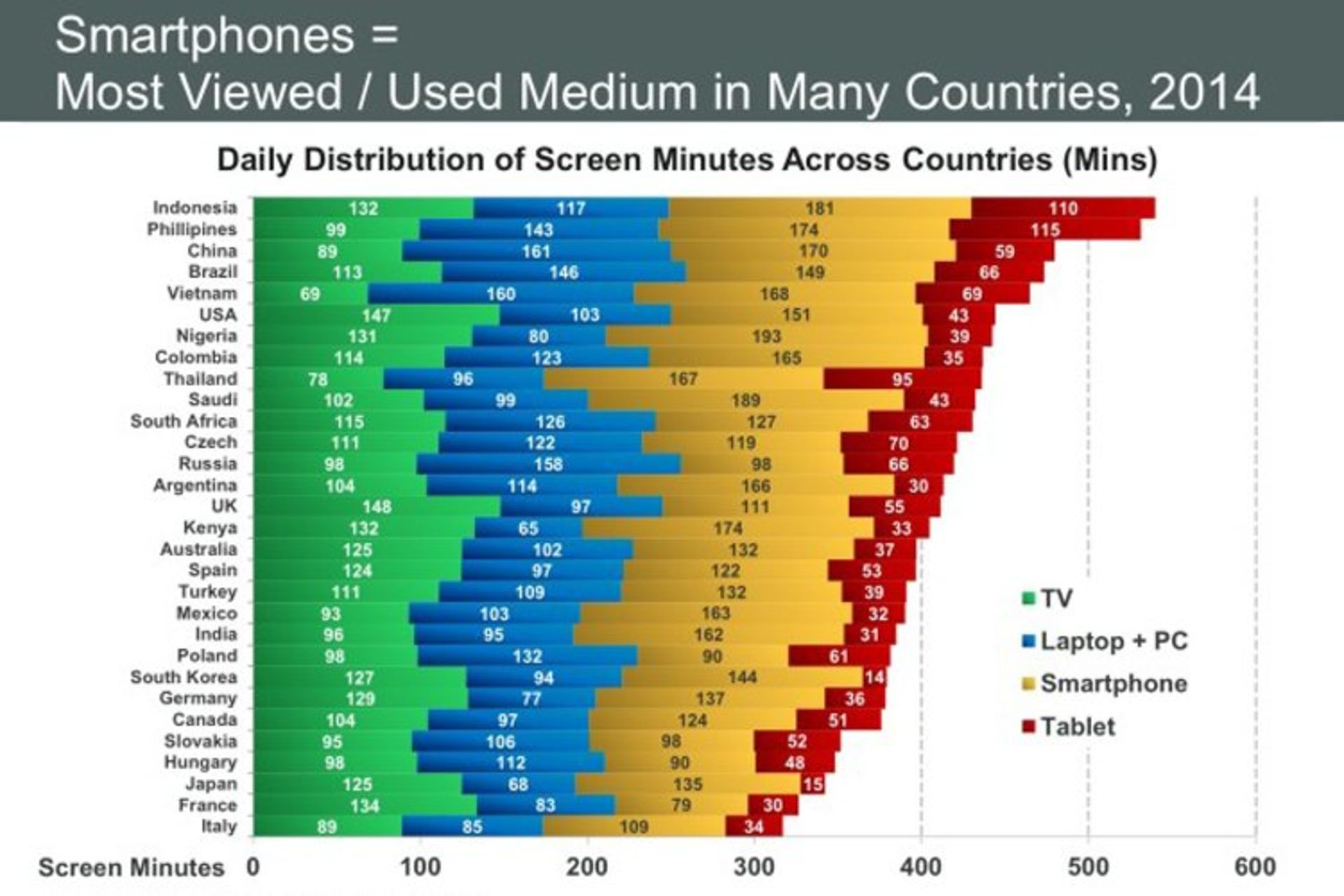 همانطور که در تصویر فوق نیز ملاحظه میکنید، دو کشور اندونزی و فیلیپین رتبههای اول و دوم را به ترتیب به خود اختصاص دادهاند. این آمار برای کشور اندونزی 540 دقیقه یا 9 ساعت در روز است که رقم جالب توجهی است. اندونزیاییها بصورت میانگین، روزانه 132 دقیقه به تلویزیون، 117 دقیقه به رایانههای شخصی، 181 دقیقه به تلفنهایهوشمند و 110 دقیقه به تبلتهای خود مینگرند! یقیناً مناظر ایجاد شده در اتوبوسها، متروها و محافل عمومی در این کشور بسیار جالب توجه خواهد بود!