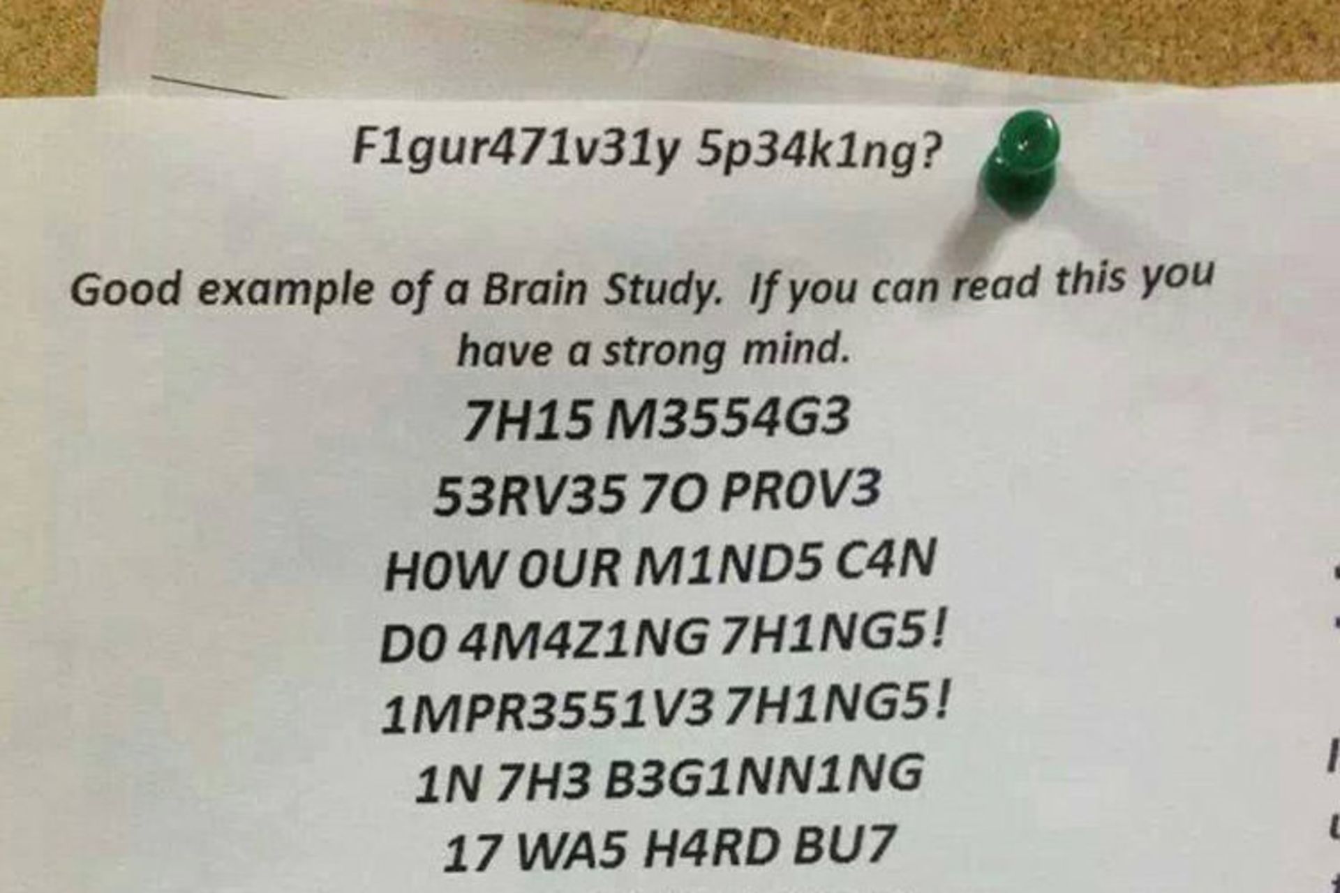 بعضا در شبکههای اجتماعی شاهد انتشار تصاویر و پیامهایی متشکل از ترکیب اعداد و حروف هستیم که در توضیحات آن به این موضوع اشاره شده که هر شخصی قادر به خواندن آن باشد، دارای هوش بالایی است. البته دانشمندان به این موضوع اشاره کردهاند که نیازی به بهرهگیری از هوش بالا نیست و اغلب افراد قادرند تا این پیامها را به راحتی بخوانند. اما محققان حقیقتی جدید را که گویای توانایی مغز در خواندن این پیامها است، کشف کردهاند.