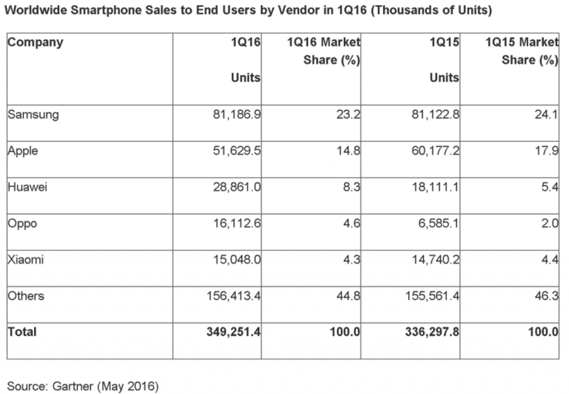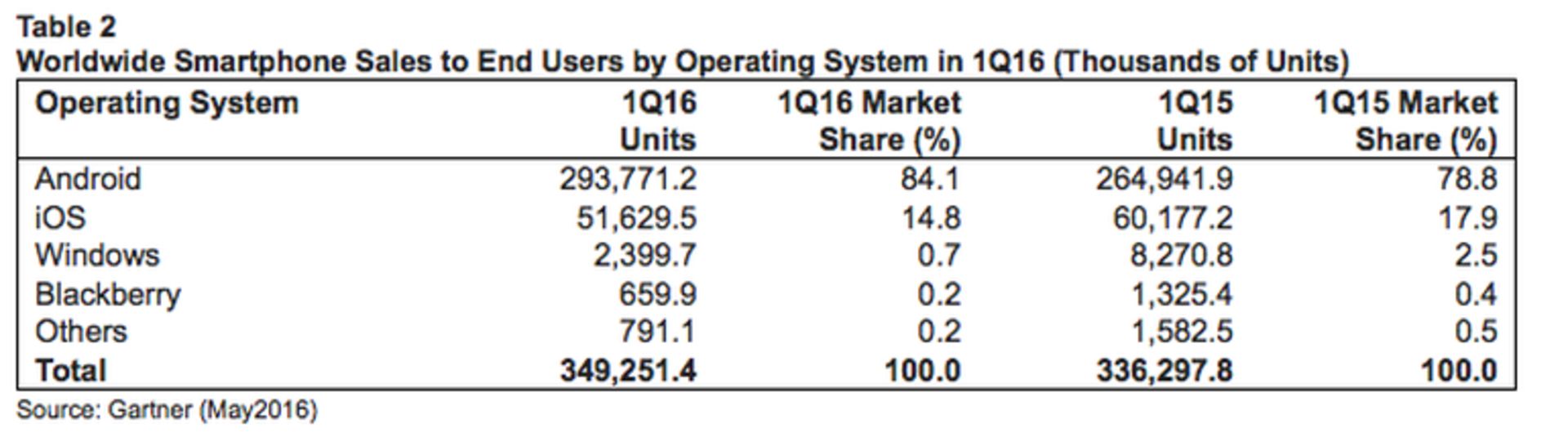 طبق اعلام مؤسسه تحقیقاتی گارتنر میزان فروش گوشیهای هوشمند در ۳ ماه اول سال ۲۰۱۶ به ۳۴۹ میلیون دستگاه رسیده است که رش ۳.۹ درصدی را نسبت به همین بازه زمانی در سال قبل نشان میدهد.