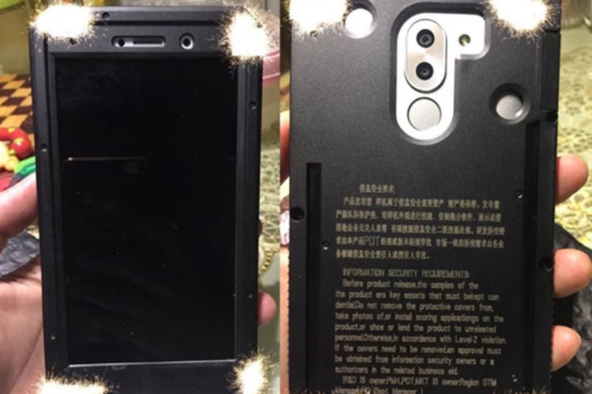 همانطور که در تصویر نیز مشاهده میکنید، در گوشههای این گوشی لکههای نورانی قرار گرفته که برای عدم نمایش جزئیات طراحی لبهها است. انتظار میرود میت ۹ که با اسم رمز منهتن شناخته میشود، همراه با دوربین ۸ مگاپیکسل سلفی، دوربین ۲۰ مگاپیکسلی دوگانه در پشت با لرزشگیر اپتیکال، تراشهی Kirin 960، چهار گیگابایت حافظهی رم و درگاه USB نوع C راهی بازار شود. البته نسخههای مجهز به حافظهی داخلی ۱۲۸ و ۲۵۶ گیگابایتی از وجود حافظهی رم ۶ گیگابایتی بهره خواهند برد. ضمنا باتری این گوشی نیز ظرفیت ۴٫۰۰۰ میلی آمپر ساعتی خواهد داشت.