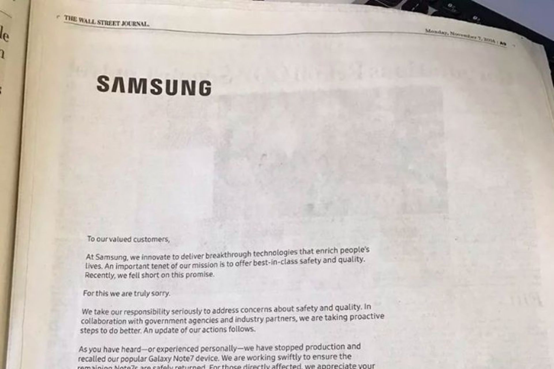 همانطور که احتمالا تاکنون متوجه شدهاید، چندی پیش سامسونگ محصولی را با نام گلکسی نوت ۷ عرضه کرد که با استقبال نسبتا خوبی مواجه شد؛ اما مدتی بعد تعدادی از آنها بنا به دلایلی منفجر شدند. سامسونگ بعد از این اتفاق مجبور شد تمام گوشیهای گلکسی نوت ۷ عرضهشده را جمعآوری کند. حال سامسونگ برای به دست آوردن حسننیت مشتریانش اقدام به عذرخواهی رسمی در این خصوص کرده است. چند روز پیش این شرکت در سه روزنامه بزرگ و پرتیراژ آمریکا بهصورت تمام صفحه از کاربرانش عذرخواهی کرد. روزنامههای وال استریت ژورنال، نیویورک تایمز و واشنگتن پست از این جمله بودند که سامسونگ از طریق آنها از مشتریان انگلیسیزبانش بهطور رسمی بابت اتفاقاتی که پیش آمدهاند عذرخواهی کرده است. این عذرخواهی توسط Gregory Lee امضا شده و گفتنی است که وی مدیرعامل سامسونگ الکترونیک در آمریکای شمالی است. در ادامه میتوانید بخشی از متن این عذرخواهی را مطالعه کنید: