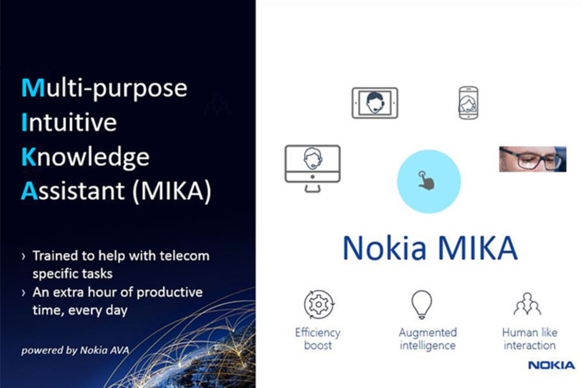 اما دستیار صوتی هوشمند نوکیا با دیدی تجاری و با کاربردی متفاوت توسعه داده شده است. البته منظور از نوکیا، بخش ارتباطات و مخابرات این شرکت است و ارتباطی با برند نوکیا که محصولاتی تحت لیسانس HMD تولید میکند، ندارد. این دستیار هوشمند که دستیار هوشمند حسی چندمنظوره (Multi-purpose Intuitive Knowledge Assistant) یا به اختصار MIKA نام دارد، یک دستیار صوتی است که بهطور اختصاصی برای مهندسان ارتباطات و مخابرات طراحی شده است. دستیار نوکیا، اطلاعاتی که برای حل مشکلات شبکه نیاز است، بهخوبی در اختیار تکنسینها و متخصصان قرار میدهد.