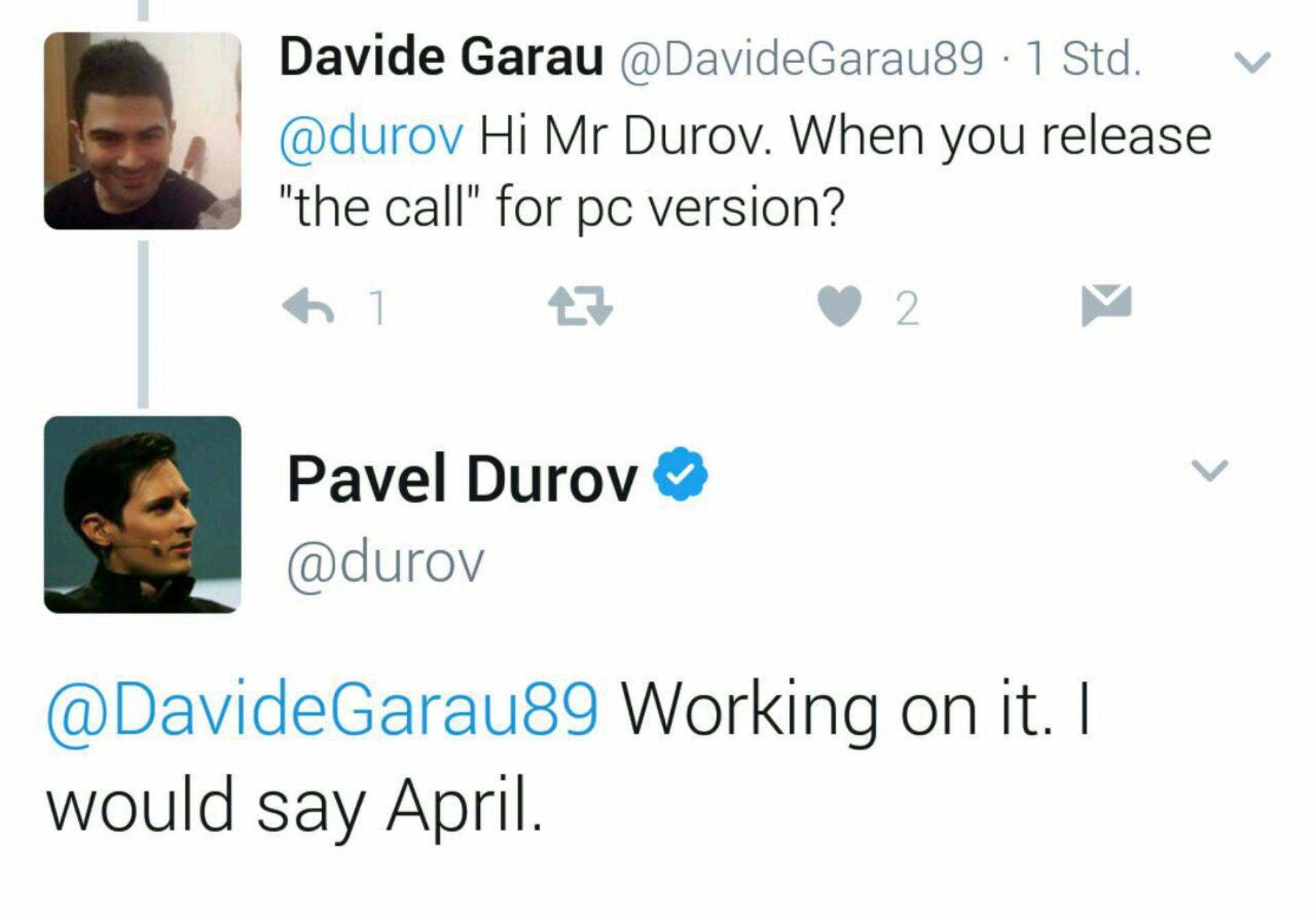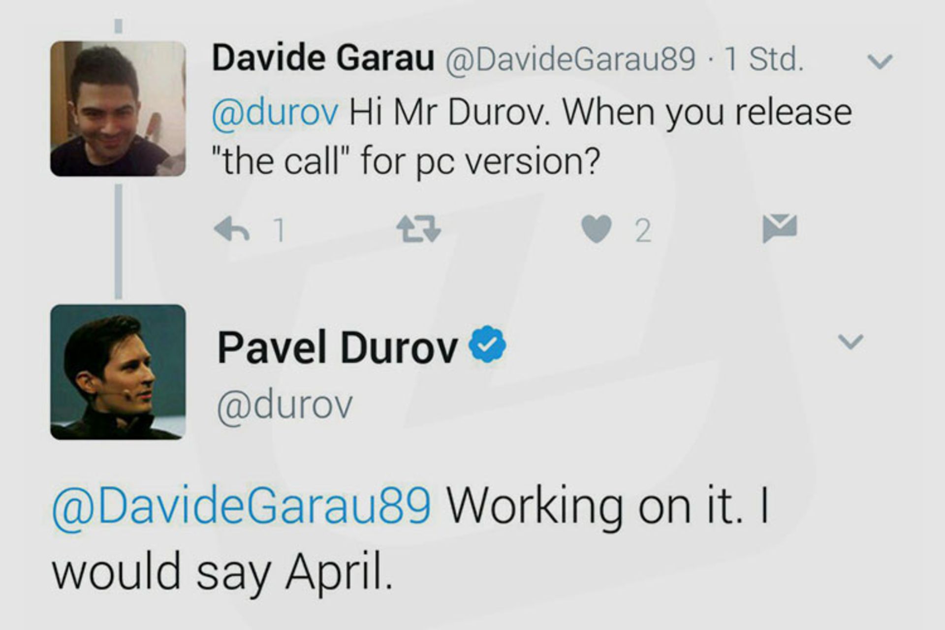همانطور که در تصویر بالا قابل مشاهده است، پاول دورف در جواب به این سؤال که «چه زمانی تماس صوتی را برای نسخهی دسکتاپ منتشر میکنید» اینگونه پاسخ داده است: