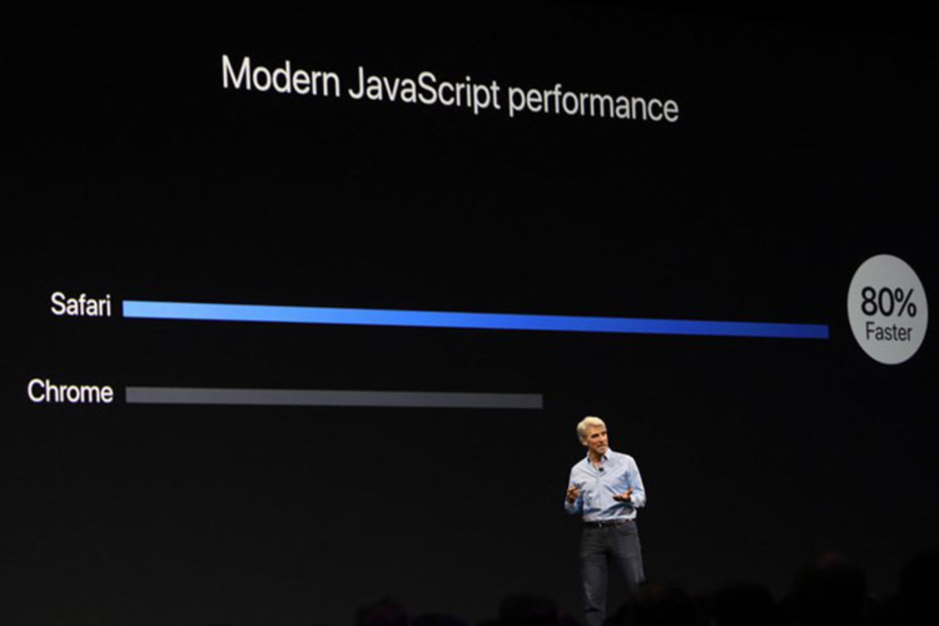 اپل لحظاتی پیش در جریان کنفرانس WWDC 2017 از نسخهی جدید سیستم عامل خود با نام macOS High Sierra رونمایی کرد. کریگ فدریگی در جریان معرفی این سیستم عامل از سافاری به عنوان سریعترین مرورگر دنیا یاد کرد و مدعی شد که نسخهی جدید این مرورگر حتی از گوگل کروم نیز سریعتر است. در تصویر ارائه شده توسط فدریگی در کنفرانس، ادعا شده است که عملکرد جاوا اسکریپت مرورگر اپل تا ۸۰ درصد سریعتر از کروم خواهد بود.