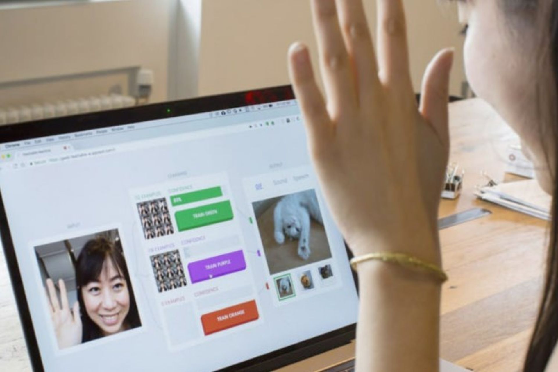 ماشین تعلیمپذیر به شما امکان میدهد که با استفاده از وبکم، با یک برنامه هوش مصنوعی کار کنید. کافی است بر روی گزینههای «Train Green» یا «Train Purple» یا «Train Orange» کلیک کنید و شیء خاصی را در جلوی وبکم بگذارید تا این ماشین آن را ببیند. وقتی که ماشین تعلیمپذیر به اندازه کافی اطلاعات در مورد آن شیء کسب کرد، هر آنچه در موردش میداند را رو میکند (ممکن است خروجی به شکل یک فایل گیف، یک صدا یا حتی بیان برخی جملات باشد). من گیاهان آپارتمانیام را روبهروی وبکم گذاشتم و به این ماشین «یاد دادم» که آنها را شناسایی کرده و پاسخ قابلقبولی ارائه دهد.
