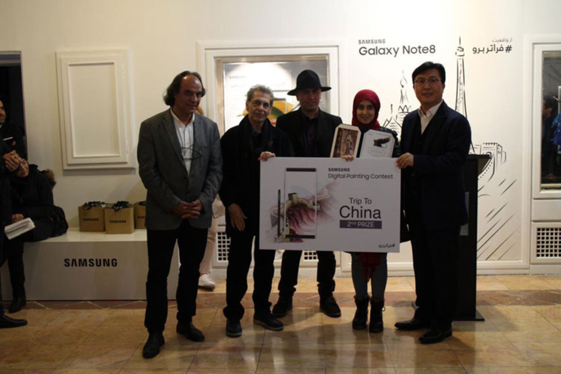 در مراسم افتتاحیه نمایشگاه آثار برگزیده مسابقه نقاشی دیجیتال از واقعیت فراتر برو در نگارخانه استاد ممیز، جمعی از هنرمندان مطرح حوزه گرافیک و نقاشی و مدیران ارشد شرکت سامسونگ الکترونیکس حضور داشتند.