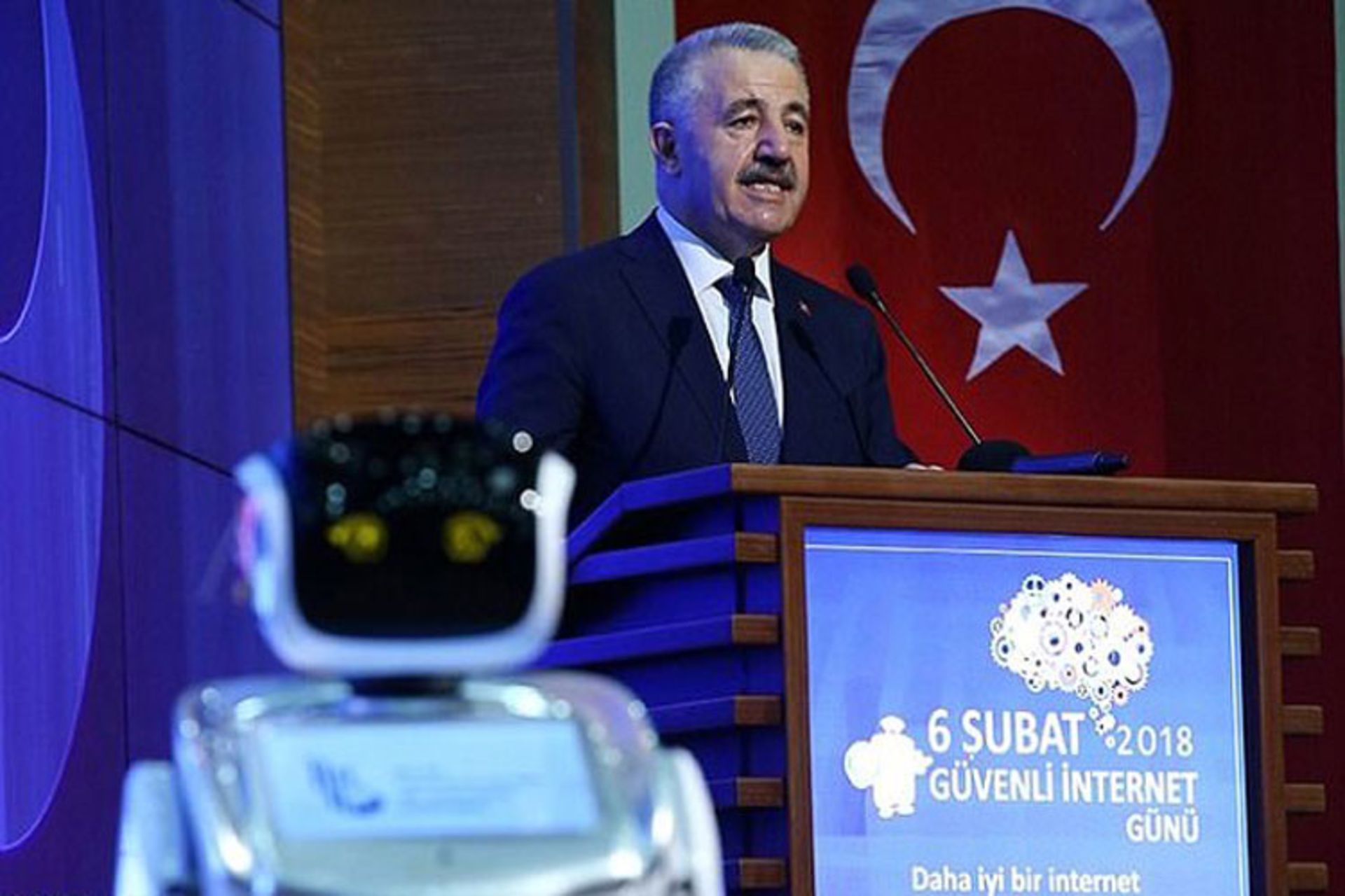 ربات، وزیر ارتباطات ترکیه را هنگام سخنرانی به آرامش دعوت کرد