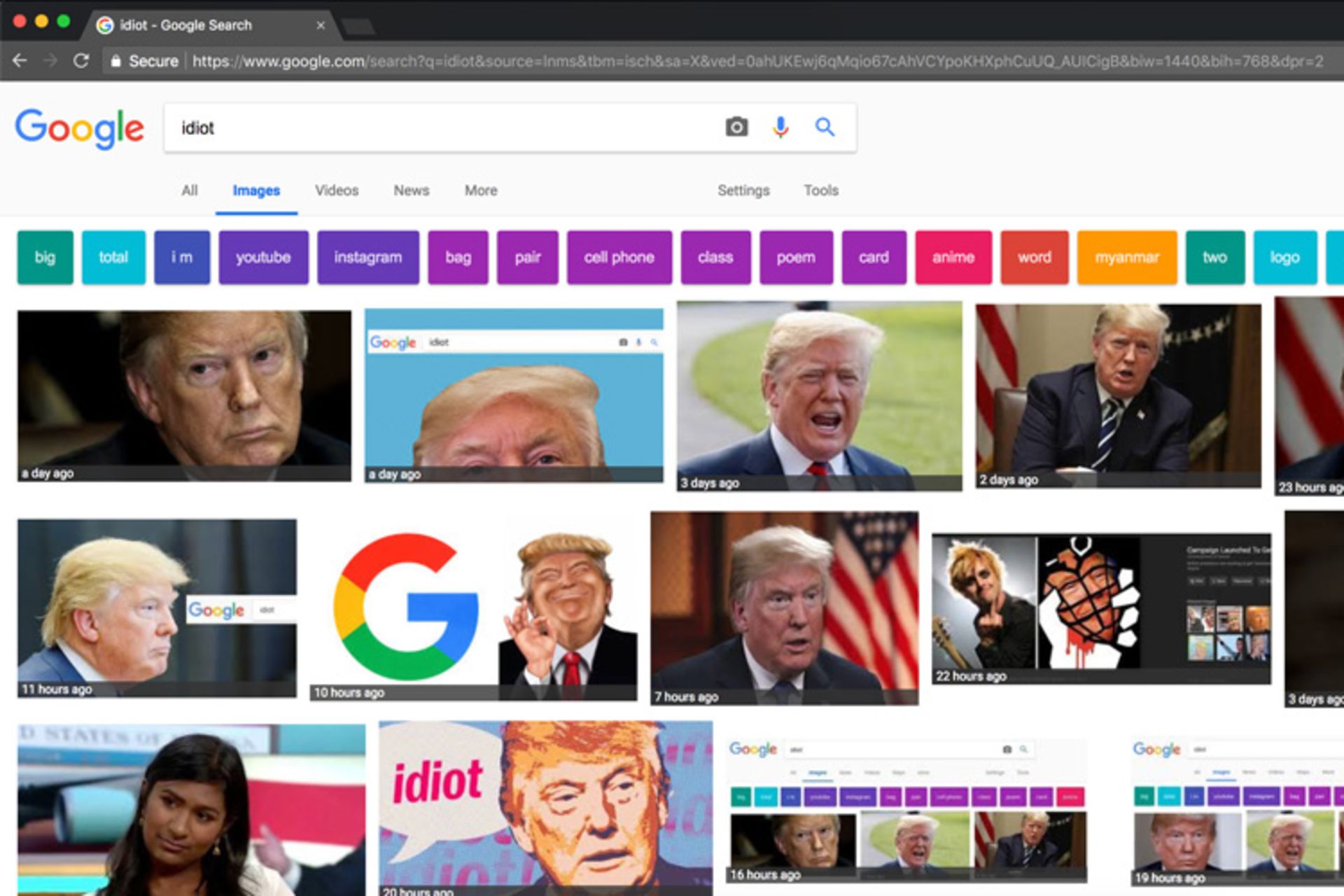 نمایش تصاویر دونالد ترامپ در نتایج تصاویر گوگل با جستجوی واژه idiot