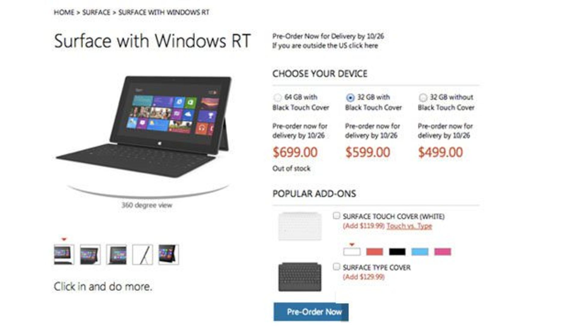 مایکروسافت قیمت Touch Cover را ۱۱۹.۹۹ دلار و قیمت Type Cover را ۱۲۹.۹۹ دلار اعلام کرده است. تاچ کاور در رنگهای سفید، قرمز، مشکی، آبی و صورتی عرضه خواهد شد.
