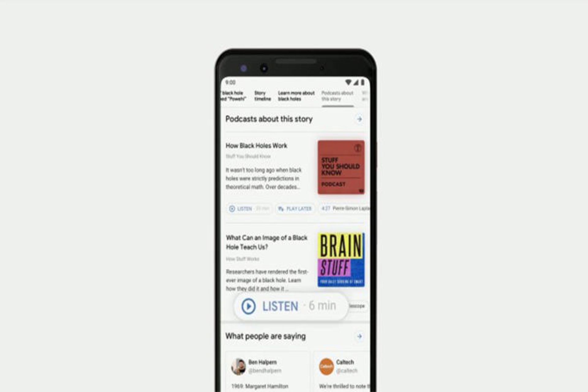 علاوهبر این، کاربران قادر خواهند بود در فهرست نتایج جستجوی گوگل به پادکستی گوش داده یا آن را برای بعد، ذخیره کنند (مثلا مواقعی که سر کار هستند).