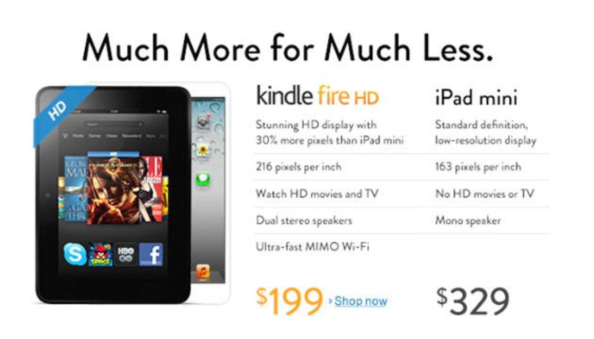 اگر بخواهیم آیپد مینی را از نظر سختافزاری با کیندل فایر HD آمازون مقایسه کنیم، آیپد مینی از هر جنبه مغلوب میشود. تقریباً همه میدانستند که اپل وارد رقابت در بازار تبلتهای ۱۹۹ دلاری نمیشود، اما اختلاف ۱۳۰ دلاری بین کیندل فایر HD و آیپد مینی از یک طرف و سخت افزار قویتر تبلت آمازون نسبت به آیپدمینی باعث شده تا بسیاری از کاربران، کیندل فایر را ترجیح دهند.