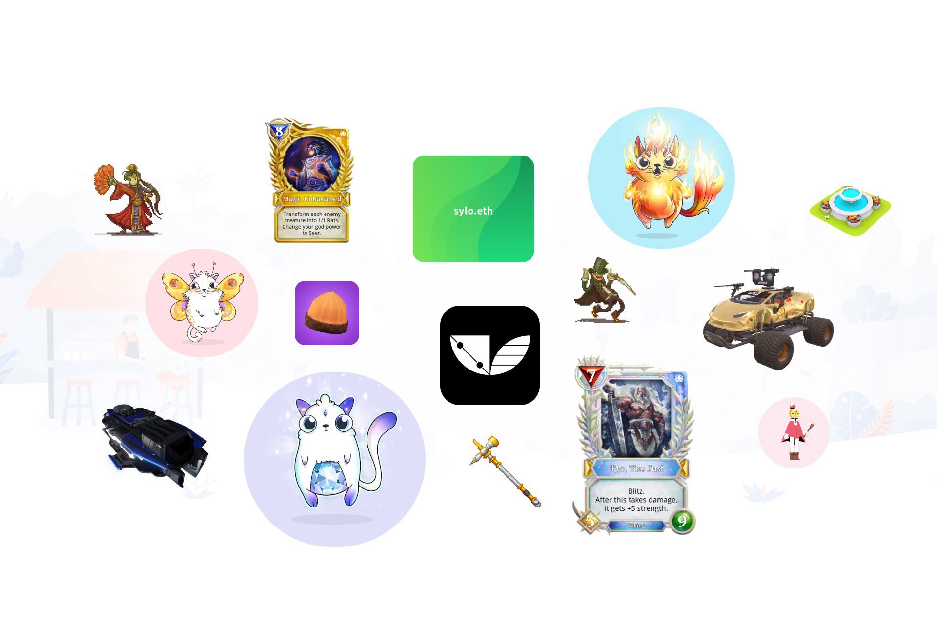 پروژهی توکن معاوضهنشدنی اتریوم به نام Ether.Cards کارتهای NFT تصادفی تولید میکنند که ویژگی خاص مانند کارمزد پلتفرم کاهشیافته و کاهش نرخهای آتی و مزایای تقسیمشده از درآمدهای جاری پلتفرم دارد. پلتفرم به هنرمندان امکان ایجاد بازیهای لاتاری، بینگو، دسمچ (Deathmatch) و... را با NFTها میدهد. NBA بزرگترین شرکتی است که توکنهای معاوضهنشدنی را بهکار گرفته است و در شراکت با سازندهی بازی CryptoKitties، یعنی Dapper Labs، توکنهای معاوضهنشدنی «لحظات برتر NBA» سال قبل را منتشر کرده است.