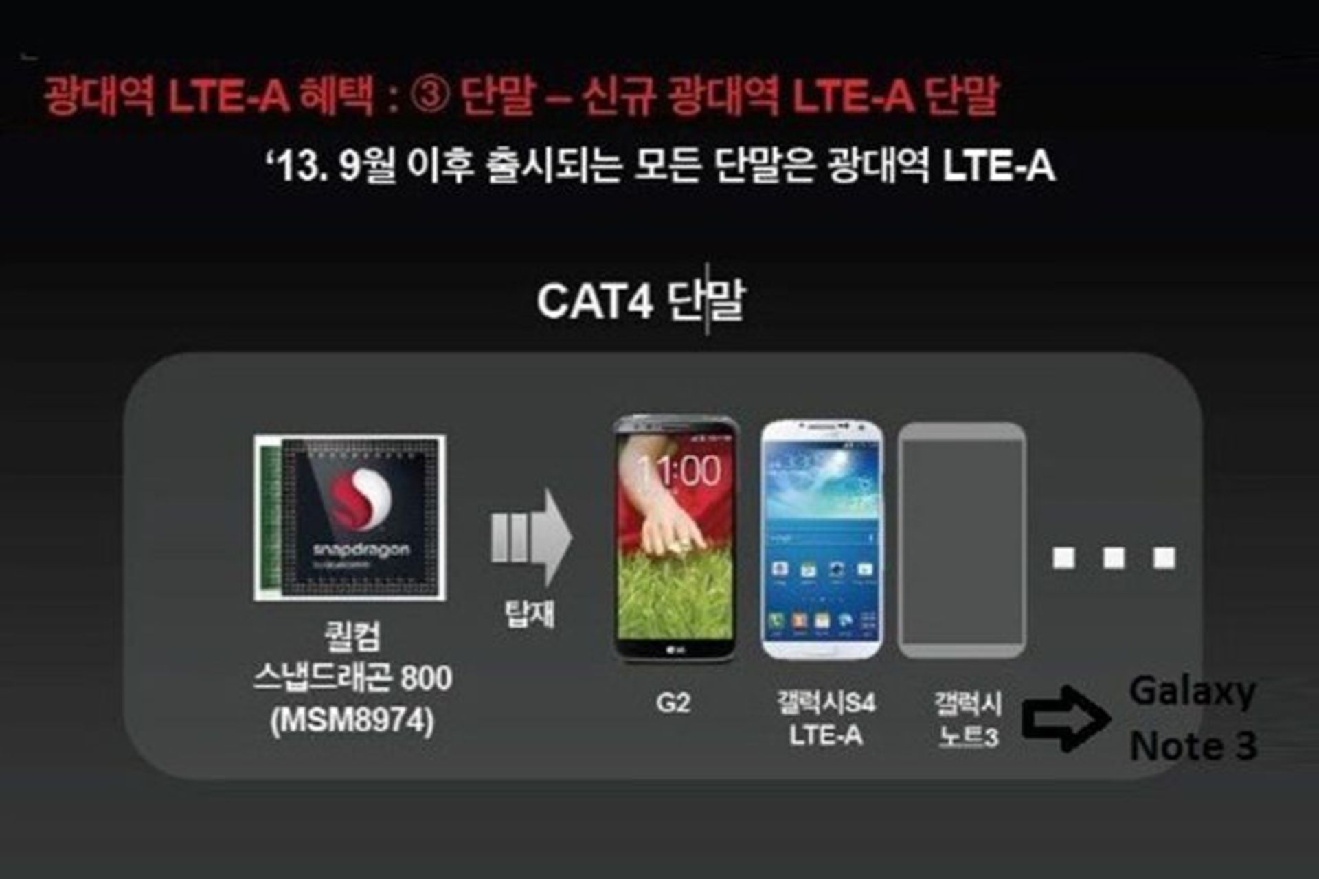 حال شبکه مخابراتی Korea Telecom در کنفرانس خود به سه تلفن چهار هستهای قدرتمند کرهای یعنی LG G2، Galaxy S4 و Galaxy Note 3 اشاره کرده و به معرفی قدرت پردازنده Snapdragon 800 بکار رفته در آنها پرداخته است. گلکسی نوت 3 همچنین از نسل جدید شبکههای مخابراتی LTE-Advance پشتیبانی میکند که سرعت انتقال اطلاعات تا 150 مگابیت در ثانیه را پوشش میدهد.