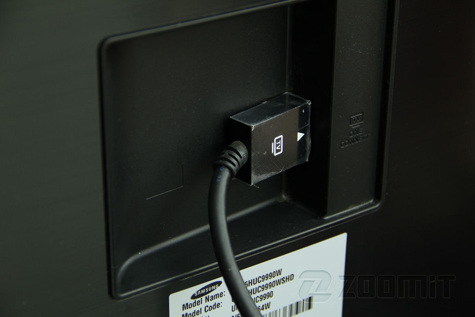در لبهی بالایی تلویزیون دوربینی قرار گرفته که با فشار دادن به نرمی بیرون میآید. دستگاه از آن برای کنترل حرکت ریموت کنترل و مکالمات تصویری در اسکایپ و نرمافزارهای دیگر استفاده میکند. مغز متفکر HUC9990یک هاب مجزا به نام One Connect است که در جعبهای مستطیل شکل قرار گرفته و با یک کابل به بدنهی تلویزیون وصل میشود. از طریق آن اتصال حافظهی USB و بقیه پورتهای دستگاه امکانپذیر میشود که بعدا در موردش بیشتر توضیح خواهیم داد.