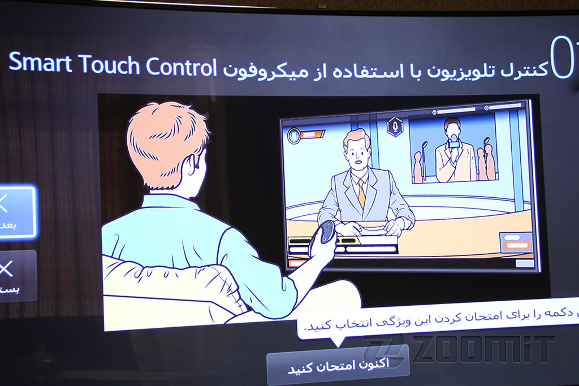 هنگامی که دکمهی Voice را فشار میدهید صدای تلویزیون کم میشود تا بتوانید فرمان صوتی را به کنترل بگویید. شاید این که یک دکمه را بر روی کنترل فشار دهید و بعد دستور صوتی را بگویید زیاد کار جالبی نباشد ولی با توجه به این که ریموت کنترل دکمههای سنتی عددی ۰ تا ۹ تغییر کانال را ندارد مثلا برای این که از شبکه ۱ به شبکه خبر بروید باید ۵ بار دکمهی افزایش کانال را فشار دهید؛ اما با کنترل صوتی میتوانید یک بار به تلویزیون بگویید تغییر کانال به ۶، یا هر دستور دیگری که خود خواسته باشید و تلویزیون بر روی کانال مورد نظر میرود، این قابلیت برای افرادی که آن را ندیده باشند بسیار جالب به نظر خواهد رسید.