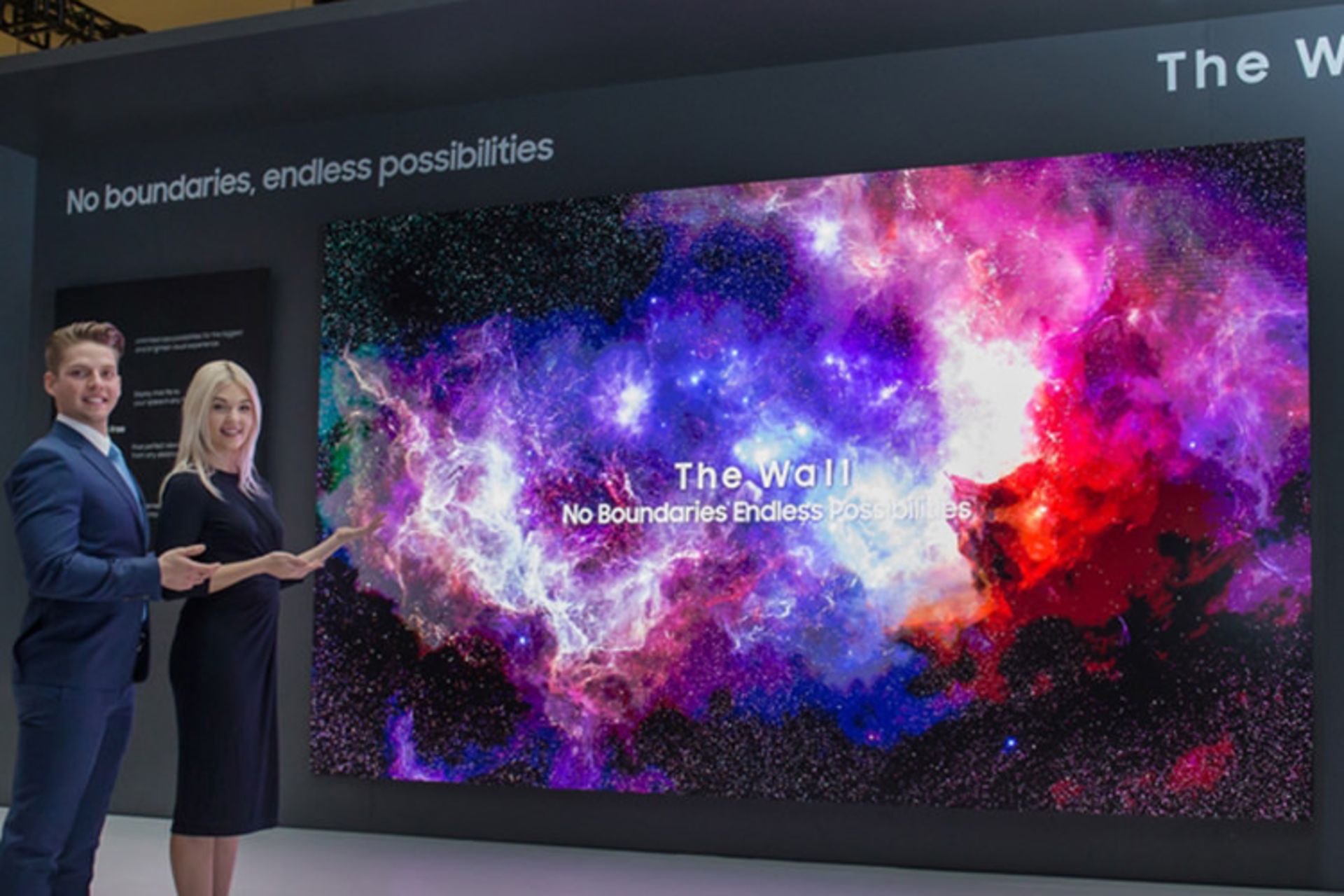 ساخت نمایشگر های بسیار بزرگ بااستفادهاز میکرو LED، جهت بکارگیری در حوزههای تجاری مختلف، یکی دیگر از جنجالیترین فناوریهای سامسونگ در حوزهی ساخت نمایشگرها در سال جاری محسوب میشود. این نمایشگر که با آرایشی از ماژولهای میکرو LED ساخته شده و جایزه نیز گرفته است، The Wall نام دارد. نمایشگر مجلل The Wall که سال گذشته رونمایی شد، با اندازهی ۲۹۲ اینچی و وضوح 8K، کیفیتی استثنایی ارائه میدهد. سامسونگ با تولید این محصول تمام محدویتهای مرتبط با اندازه، وضوح و نسبت تصویر در نمایشگرهای بزرگ را پشت سر گذاشته و صفحهنمایشی بدون قاب تولید کرده است.