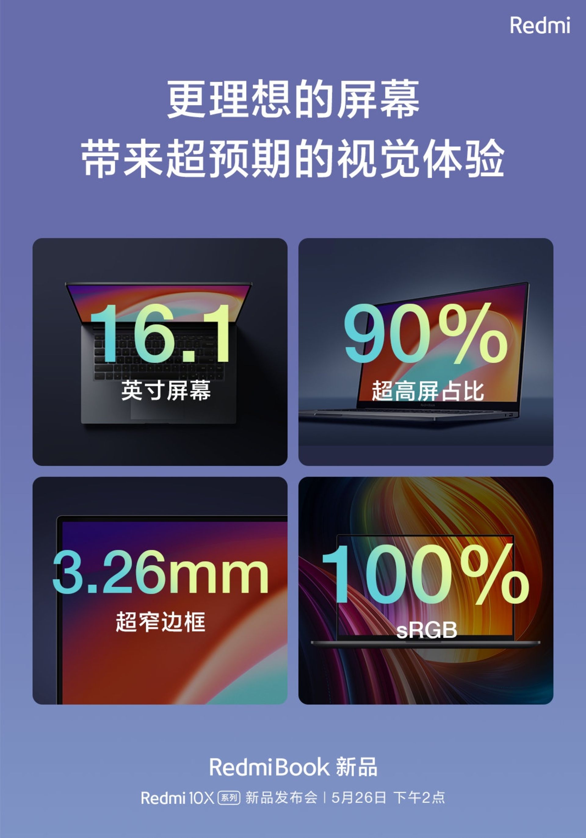 شیائومی اعلام کرده است که لپتاپ ۱۶/۱ اینچ ردمی‌بوک قرار است حاشیه‌هایی بسیار اندک در اطراف نمایشگرش داشته باشد تا به‌ظاهری مدرن مزین شود. شیائومی ضخامت حاشیه‌ی اطراف صفحه‌نمایش این لپ‌تاپ را تنها ۳/۲۶ میلی‌متر اعلام کرده است. داشتن این حاشیه‌ی اندک باعث می‌شود نسبت نمایشگر به بدنه‌ به ۹۰ درصد برسد. همچنین گفته می‌شود صفحه‌نمایش لپ ‌تاپ شیائومی ردمی‌بوک ۱۶/۱ اینچ پوششی ۱۰۰ درصدی از فضای رنگی sRGB ارائه می‌دهد. دیگر مشخصه‌ی مهم لپ‌تاپ شامل بهره‌مندی آن از تراشه‌ی سری رایزن ۴۰۰۰ AMD است. برخی منابع می‌گویند ردمی‌بوک ۱۶/۱ اینچ از تراشه‌ی رایزن ۵ یا رایزن ۷ استفاده می‌کند.