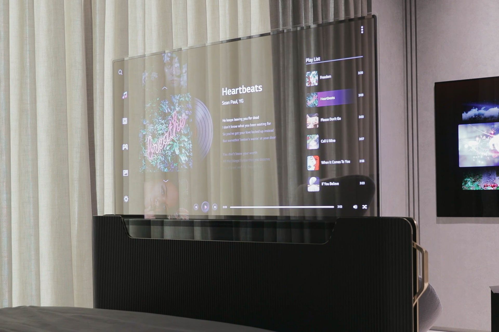 تلویزیون OLED شفاف الجی را میتوان در جاهای مختلف خانه قرار داد و برای استفاده از آن مجبور نیستید که تلویزیون را در بخش پایینی تخت خواب نگه دارید. البته در نظر داشته باشید که امکان چنین کاری به هنگام عرضهی رسمی محصول فراهم میشود و در حال حاضر نمیتوانید تلویزیون الجی را خریداری کنید.