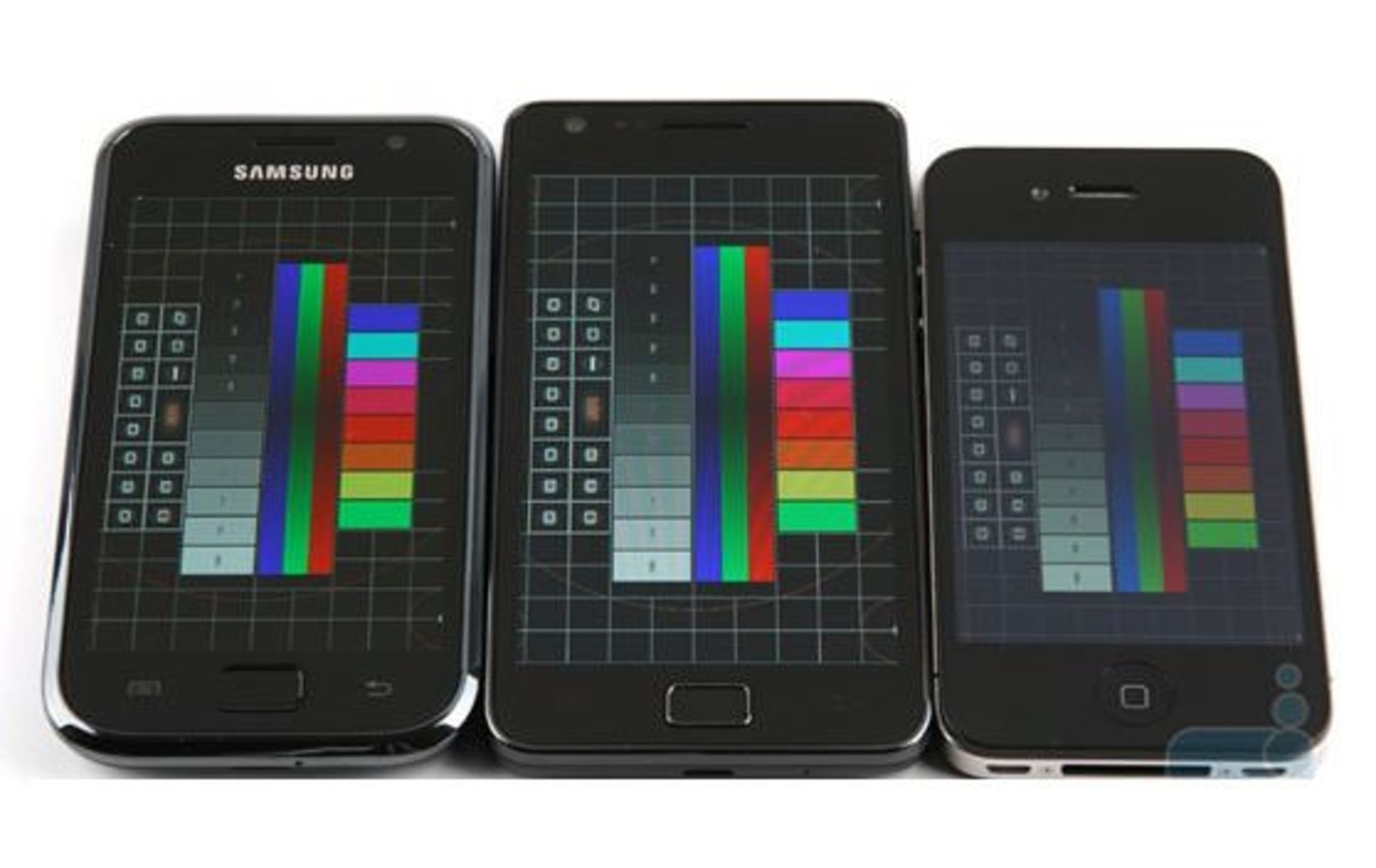 نمایشگر Retina یا همان LCD-TFT Ips ساخت LG در iPhone 4، نمایشگر Super AMOLED در Galaxy S و نمایشگر Super AMOLED Plus نیز در نسل دوم Galaxy یعنی Galaxy S2 بکار گرفته شده است در این آزمایش که توسط PhoneArena انجام شده است این سه نمایشگر به طول کامل و در یک استدیو حرفه ای با یکدیگر مقایسه شدهاند: