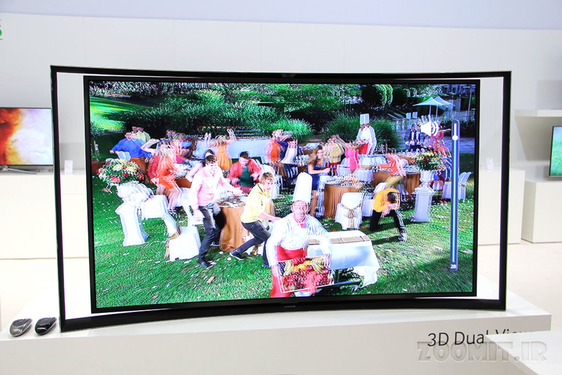 بخش بزرگی از نمایشگاه Samsung Forum 2014 که در مالاگای اسپانیا در حال برگزاری است به تلویزیونهای مختلف سامسونگ از اولترا اچدیها گرفته تا تلویزیونهای خمیده اختصاص یافته است. اما در این بین چند محصول متفاوت و شاخص وجود دارد که یکی از آنها تلویزیون OLED خمیده با قابلیت پخش همزمان دو تصویر سه بعدی است. این بدین معنا است که دو نفر با استفاده از عینک میتوانند دو تصویر جداگانه سه بعدی را در یک تلویزیون و بصورت همزمان مشاهده کنند.