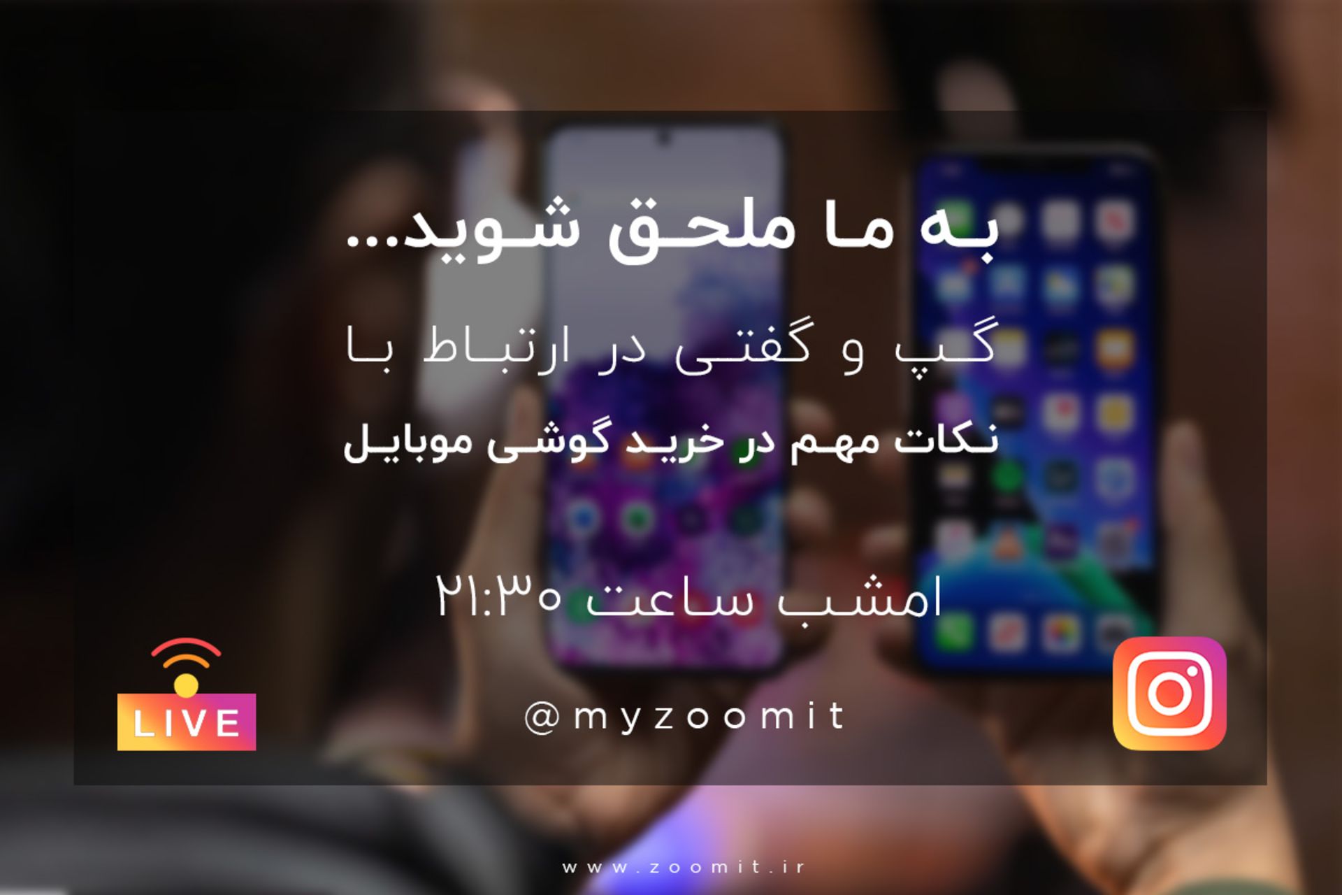 اگر بهدنبال خرید گوشی جدیدی هستید و اطلاعات زیادی از دنیای موبایل و فناوری و مشخصات فنی آنها ندارید، با زومیت همراه باشید. این موضوع بحثی است که امشب در اینستاگرام زومیت دنبال میکنیم. برای دسترسی به صفحهی اینستاگرام زومیت، میتوانید از آدرس زیر یا جستوجوی آیدی myzoomit در بخش جستوجو اینستاگرام استفاده کنید.