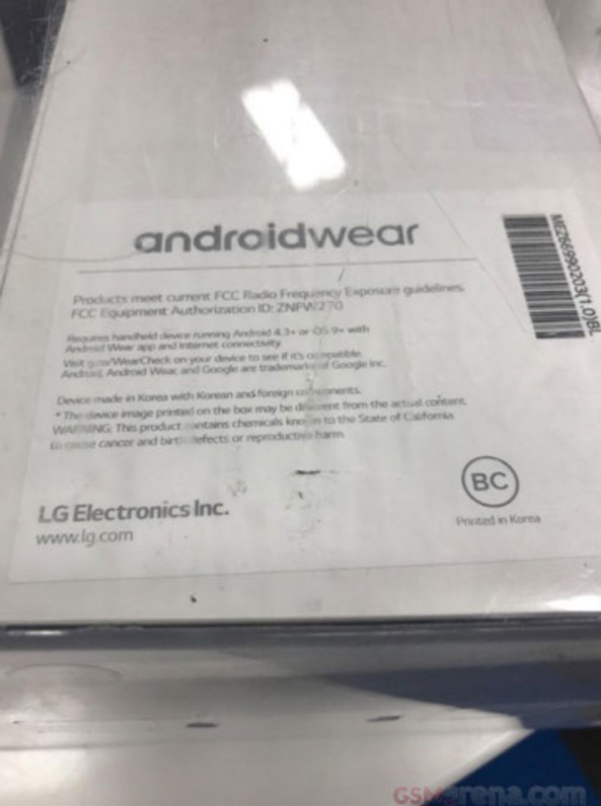 در پشت جعبهی این ساعت هوشمند، یک برچسب امنیت و در سمت دیگر آن کدنام دستگاه مورد بحث (LG-W270) به چشم میخورد. علاوه بر این اطلاعاتی در مورد اینکه ساعت الجی واچ ماه گذشته در کرهی جنوبی تولید شد، روی جعبه دیده میشود و به همین دلیل میتوان گفت توزیع این محصول شروع شده است.
