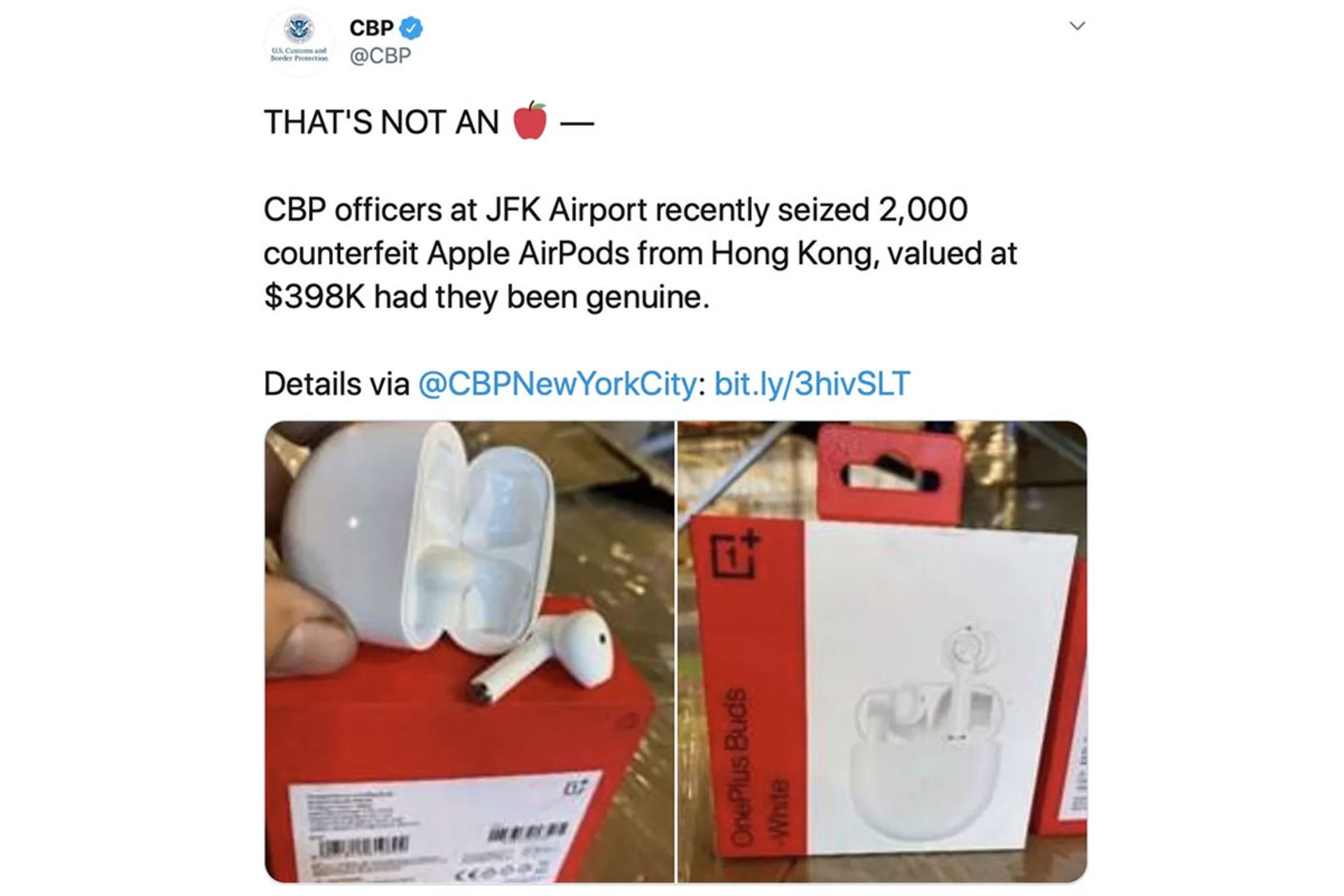 مشکل اصلی توییت و بیانیهی CBP این است که باتوجهبه تصاویر منتشرشده توسط همان سازمان، ایربادهای کشفشده درواقع وانپلاس بادز هستند. این ایربادها در جعبههایی بودهاند که به روشنی نام شرکت سازنده روی آنها دیده میشود. CBP در توییتر با افتخار نوشت: «THAT'S NOT AN APPLE». برخی رسانهها لحن این سازمان را شبیه به کارشناسی خبره تفسیر میکنند که گویی یک شی عتیقهی تقلبی متعلق به قرن ۱۸ را کشف کرده است! اگرچه نمیتوان تأیید کرد که همهی دو هزار دستگاه ضبطشده، وانپلاس بادز بودهاند، اما بههرحال تصاویر خود سازمان CBP نشان میدهد که آنها اشتباه بزرگی مرتکب شدهاند. محمولهی دو هزار تایی از هنگکنگ به فرودگاه JFK رسیده بود و پس از ضبط در تاریخ ۳۱ آگوست به نوادا رفت. اگه همهی محوله شامل وانپلاس بادز باشد، باتوجهبه قیمت ۷۹ دلاری محصول شرکت چینی، کل محموله ارزشی ۱۵۸ هزار دلاری خواهد داشت.