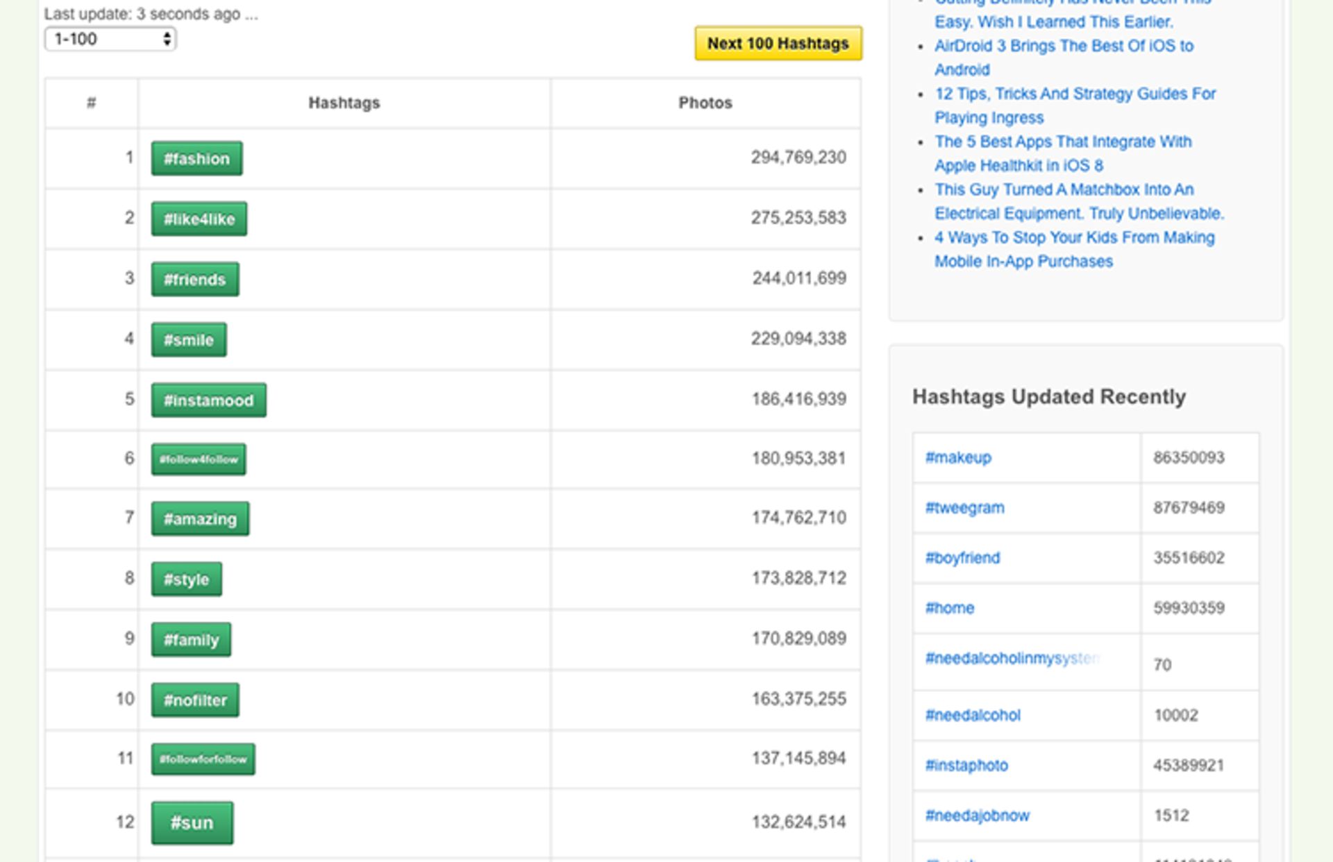 https://top-hashtags.com/ از جمله وبسایتهای بسیار خوبی است که میتواند اطلاعات بسیار خوبی را درباره هشتگهای برتر شبکههای اجتماعی مختلف در اختیار شما بگذارد. برای مثال هماکنون در شبکه اشتراک گذاری عکس اینستاگرام، هشتگ Fashin# با ۲۹۴ میلیون پست که با آن منتشر شده به عنوان برترین هشتگ این شبکه اجتماعی شناخته میشود.