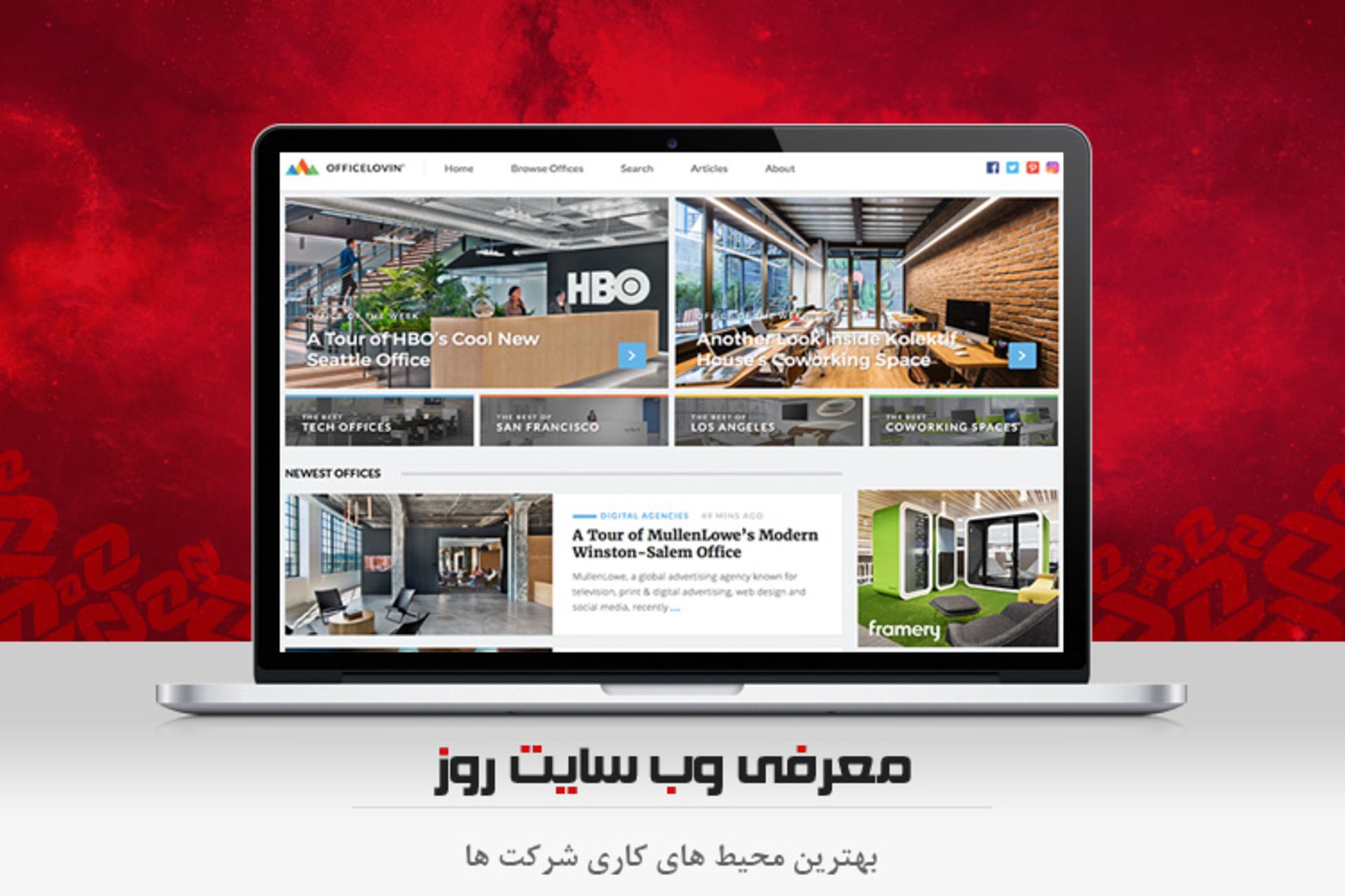 وبسایت officelovin با هدف معرفی محیطهای کاری شرکتهای مختلف - چه کوچک و چه بزرگ - قصد دارد محیطهای مختلف کاری را به افراد و مدیران شرکتهای دیگر نشان دهد. برای استفاده از این وبسایت نیازی به زبان انگلیسی قوی ندارید و با توجه به نام شرکت و عکسهایی که از محیطهای کاری آن تهیه شده است، میتوانید محیطهای مختلف را مشاهده کنید و حتی از آنها الگو بگیرید.