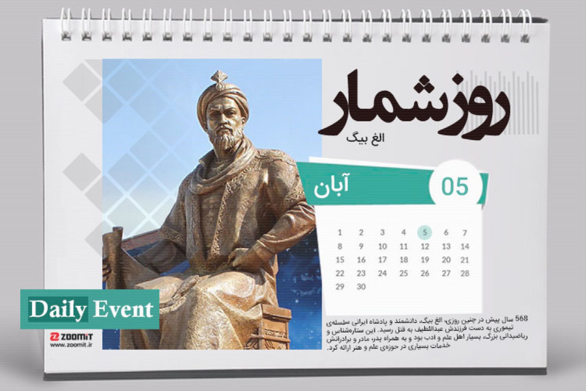 ۵۶۸ سال پیش در چنین روزی (۵ آبان سال ۸۲۸ هجری خورشیدی)، میرزا محمد تَراغای بن شاهرخ معروف به الغ بیگ، پادشاه تیموری و دانشمند سرشناس ایرانی به دست فرزندش عبداللطیف کشته شد. الغ بیگ در منطقه سلطانیه در شمال غرب ایران که در حال حاضر یکی از شهرهای استان زنجان محسوب میشود و در ۴۳ کیلومتری شهر زنجان واقع شده است، دیده به جهان گشود.