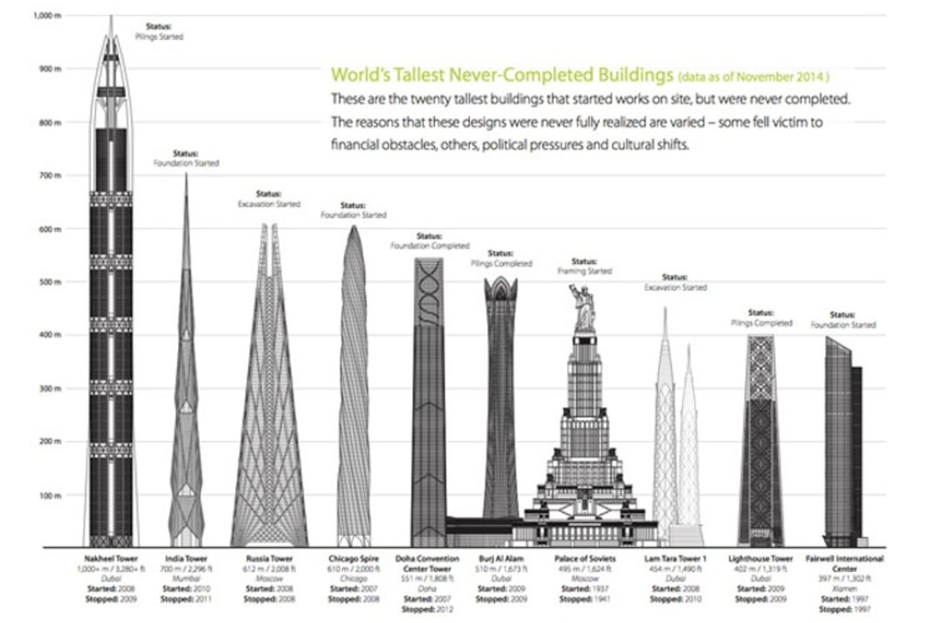 در تصویر فوق میتوانید اینفوگرافیک بیست مورد از بلندترین ساختمانهایی را مشاهده کنید که عملیات ساختشان نیمه کاره رها شده است. در این لیست نام قصر شوراها (Palace of Soviets) به ارتفاع ۴۹۵ متر واقع در شهر مسکو نیز دیده میشود. این برج در جنگ جهانی دوم توسط نیروهای متخاصم نابود شد. دیگر برج نیمهکاره در این لیست، Metropolitan Life North Annex با ارتفاع ۳۹۰ متر بوده که در شهر نیویورک واقع شده است. عملیات ساخت این برج از طبقه ۳۱ به بعد به طور کامل متوقف شد.
