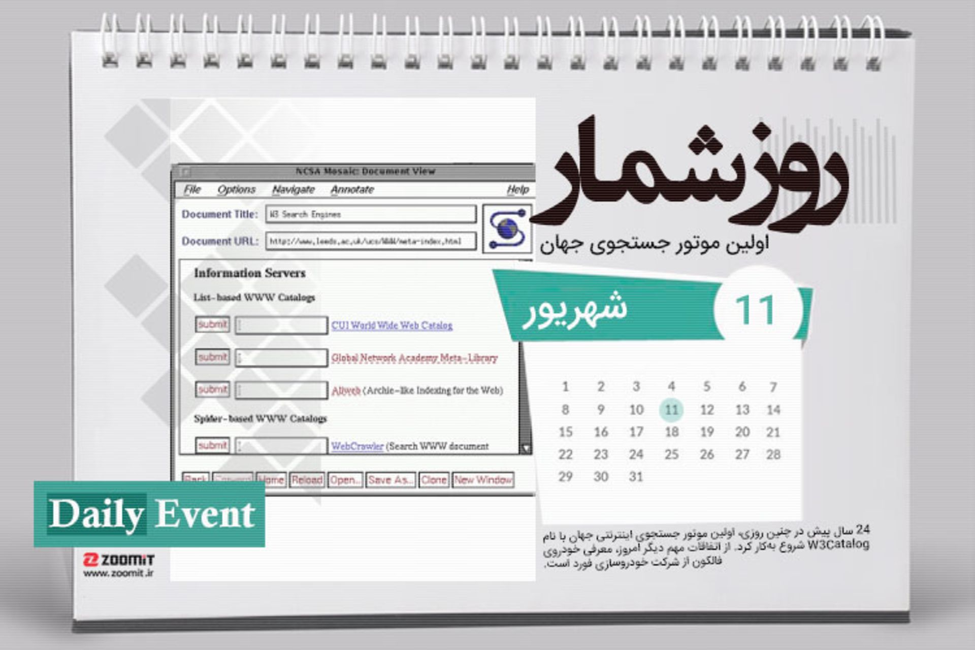 ۲۴ سال پیش در چنین روزی (۲ سپتامبر سال ۱۹۹۳)، اولین موتور جستجوی جهان با نام W3Catalog یا CUI WWW Catalog در مرکز تحقیقات دانشگاه جنوا شروع به کار کرد. توسعهدهندهی این موتور جستجوی وب، اسکار نیستراش بود. این وبسایت جستجو به مدت ۳ سال فعالیت میکرد و سپس با موتورهای پیشرفتهتر جایگزین شد.