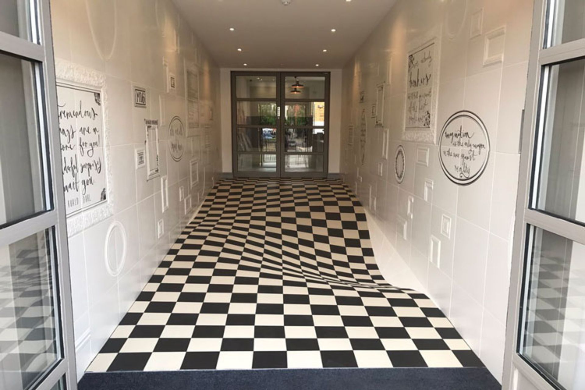 هرچند شاید دلیلی نداشته باشد کسی بخواهد در راهروی یک نمایشگاه بدود؛ اما بههرحال این طرح باعث میشود اگر کسی چنین تصمیمی دارد قبل از اقدام با نگاهی به کف راهرو از این کار منصرف شود. با اینکه طراحان انگلیسی به ما اطمینان میدهند که این کاشیها کاملا مسطح هستند، وقتی از زوایای خاصی به آنها نگاه کنیم واقعا به نظر میرسد که گودال بزرگی در وسط راهرو وجود دارد. جالبتر آن که وقتی از سمت مقابل نگاه کنید، آن گودال مانند یک برآمدگی بزرگ به نظر میآید. هر دو حالت باعث میشوند که بازدیدکنندگان آن محل از حرکت سریع در آن بخش خودداری کنند.