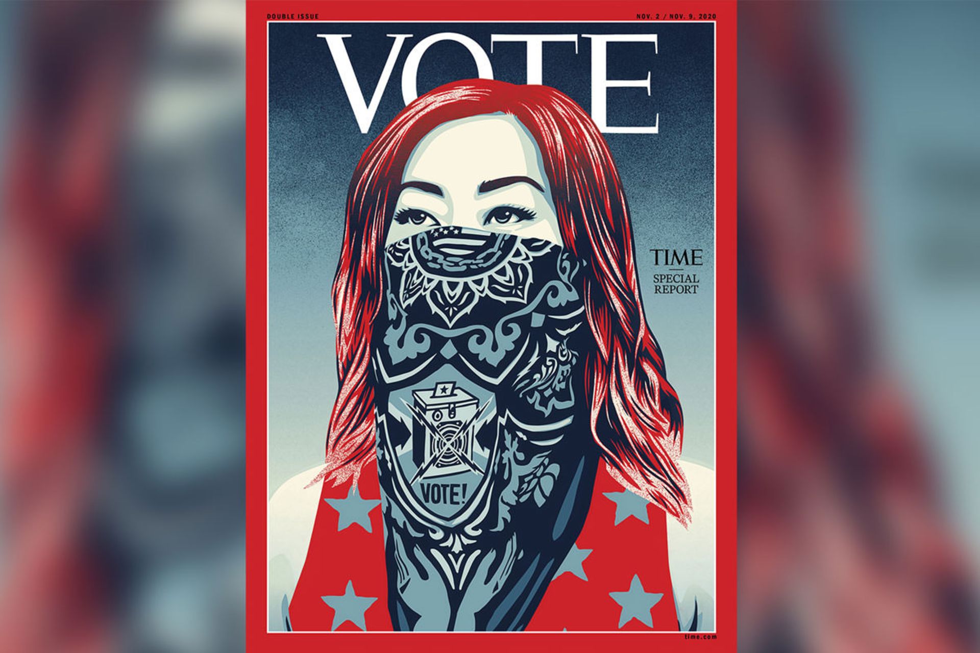 کاور شماره جدید مجله تایم از حاشیههای قرمزرنگ برخوردار است که در شمارههای قبلی نیز مشاهده میشد؛ اما لوگوی بالای مجله از عبارت «TIME» به «VOTE» (بهمعنی رأی دادن) تغییر یافته است تا سران مجله بهنوعی حساس بودن شرایط کنونی ایالات متحده را نشان دهند. چنین اقدامی در نوع خود بیسابقه است و درواقع برای اولین بار در صد سال گذشته، لوگوی مجله تایم تغییر پیدا میکند.