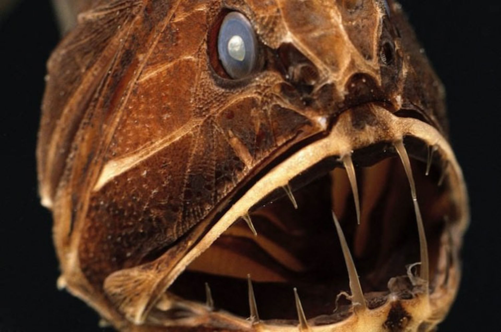 ماهی دندان نیش که با نام علمی آنوپلوگاستر کورنوتا (Anoplogaster Cornuta) نیز نامیده میشود گویی از تیرهترین کابوسهای شبانهمان برخاسته است. این جانور نیز در اعماق اقیانوس چیزی نزدیک به ۴۸۰۰ متر زیر سطح زندگی کرده و به خاطر ظاهر ناخوشایندش غول ماهی هم خوانده میشود. رنگ آن از قهوهای تیره تا مشکلی متغیر بوده و تا ۱۵ سانتیمتر رشد میکند. در مقایسه با جثه کوچکش سر بزرگی دارد و دهانی که با تعدادی دندان نیش مانند تیز احاطه شده است .